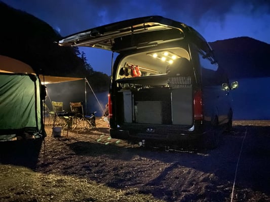 5/4 行ってきました!!初の湖畔キャンプin本栖レイクサイドキャンプ場\(^o^)/ 水際に車を止めてタープをはって・・