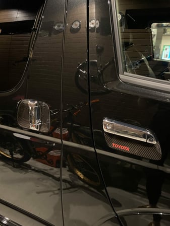 5/6  ハイエースのプチカスタムシリーズ♪ 車のドアノブのところ、よくつめでキズがついて気になりませんか??特に黒い車(><)そこでキズ防止の保護シールが車種専用設計でいろんなとこからいろんなのがでてるんです♪ぼくはTOYOTAのロゴ入りカーボン調シールにしました(^-^)