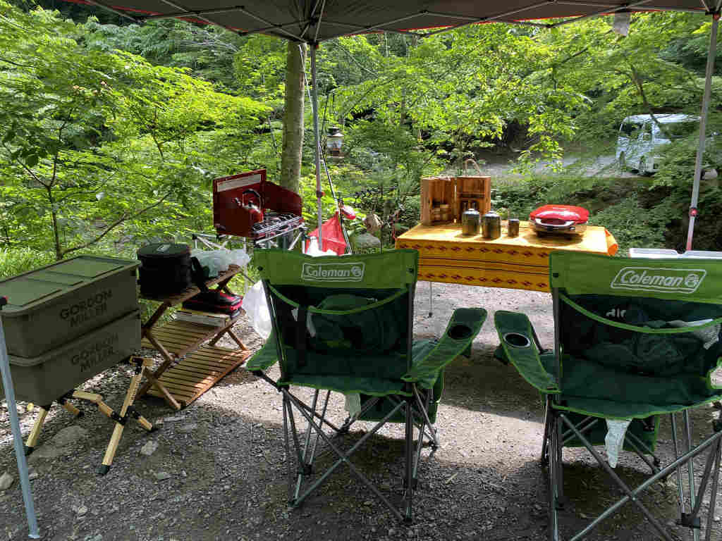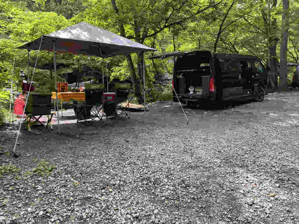 6/29 お客様のオススメで山梨県道志村にある「道志の森キャンプ場」にいってみました\(^o^)/森の中にあり川沿い全部がフリーサイト、予約不要の素晴らしいキャンプ場❤ とりあえず場所決めて設営♪