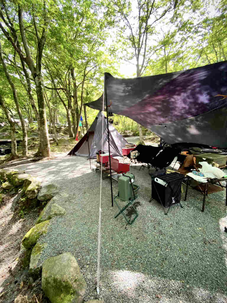 川沿いにテントとタープを張って目の前で釣り❤