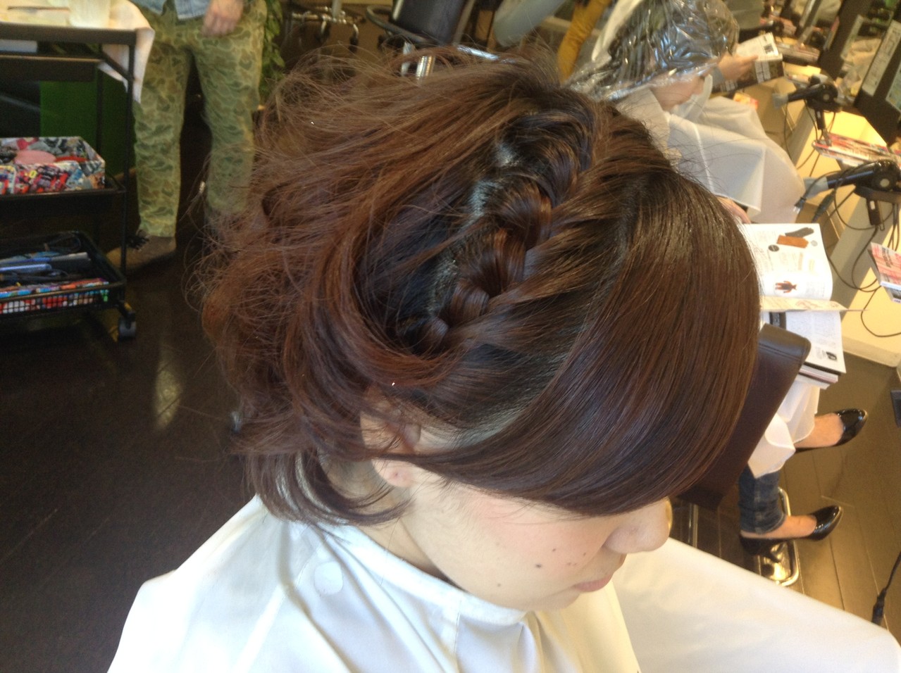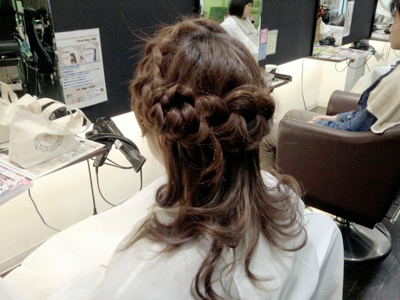 髪型は、サイド〜バックに編み込みをいれて、さりげなく散らして