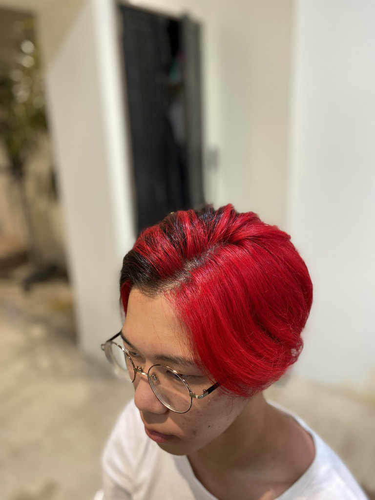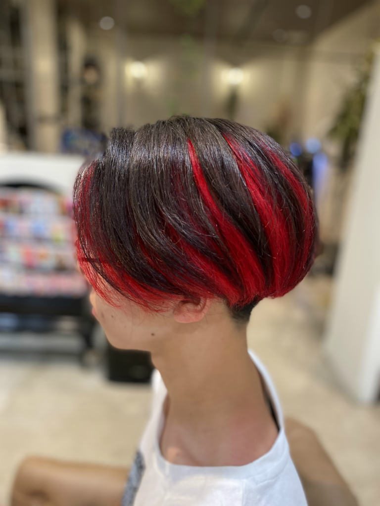 7/20 松戸市よりお越しの高校二年生のM覇様!夏休みなので髪を赤くしたい・・・との事で全部まっ赤はさすがにめだちすぎでしょ・・・とゆーことでオオゼキセンス?でトップはダークシルバーに染めて、内側を新色「エノグカラー」のホリッカーレッドをぶち込んでみました!!分け目を変えるだけでレッド出かたが変わるのでけっこう楽しめますね(*^^*)