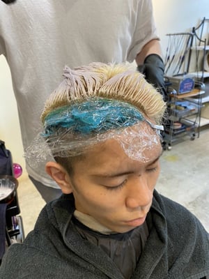 6/9 新松戸よりお越しの沖縄人・K様(^^)/ 三日後い後楽園ホールでテッペンジムよりプロデビュー!!とゆーことで髪を仕上げにご来店(=゚ω゚)ノ トランクスが緑なので、髪もプラチナシルバーをベースにして一部緑を入れたい・・・とゆーめんどくさい・・・じゃなかった💦ハイセンスな要求をされたので、嫌がりながら・・・じゃなかった💦気合いをいれながら施術させて頂きましたm(__)mまづは一度目ブリーチ+追いブリーチ・・・!